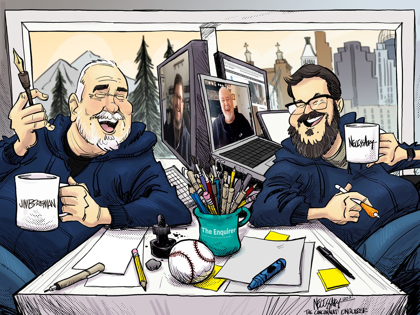 Jim always lent his support when it came to my career. While my nine years drawing cartoons for WCPO-TV and, later, The Cincinnati Enquirer, pale in comparison to Jim’s 32 years at the Enquirer, it was still an honor to follow in his footsteps as a cartoonist in our shared hometown. I honestly don’t know Jim that well, but I do know how special it is to have had someone of Jim’s caliber in my corner, and I still get a thrill when he sends a text or message complimenting one of my cartoons.