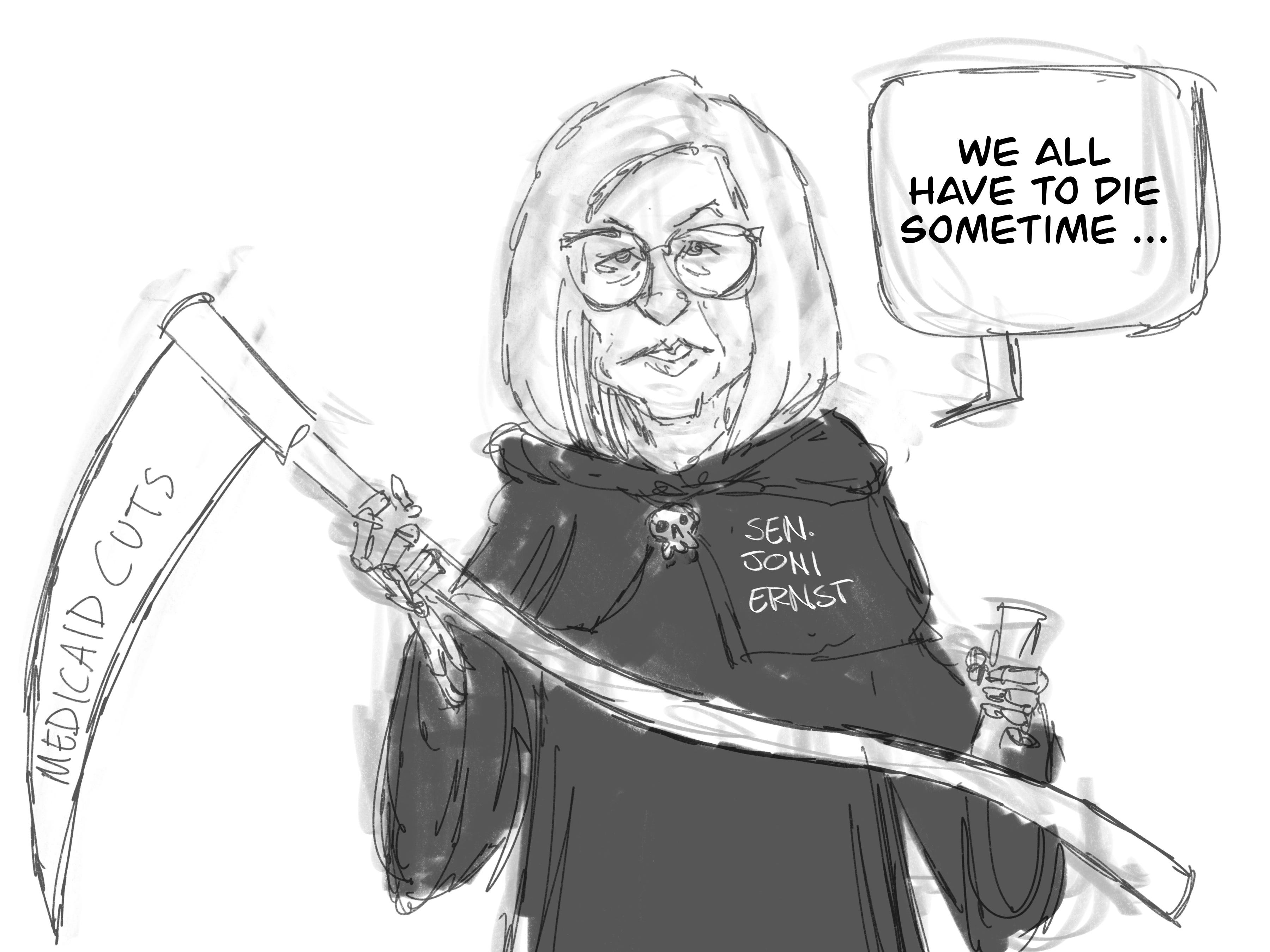 Iowa Sen. Joni Ernst did just that last week during a town hall when her constituents confronted her about the Medicaid cuts in TACO Trump’s “One Big Beautiful Bill.” Her response: “We’re all going to die.”