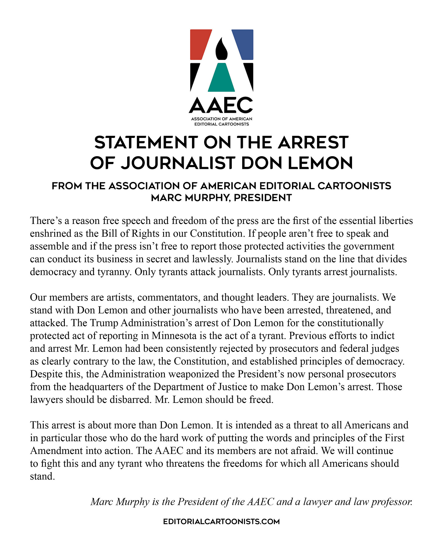 In solidarity with Lemon, Fort, and other journalists who have been targeted by the Trump regime, Marc Murphy, president of the Association of American Editorial Cartoonists, released the following statement about this egregious violation of the First Amendment. (Full disclosure: I am both an AAEC member and the AAEC’s Minister of Information.)
