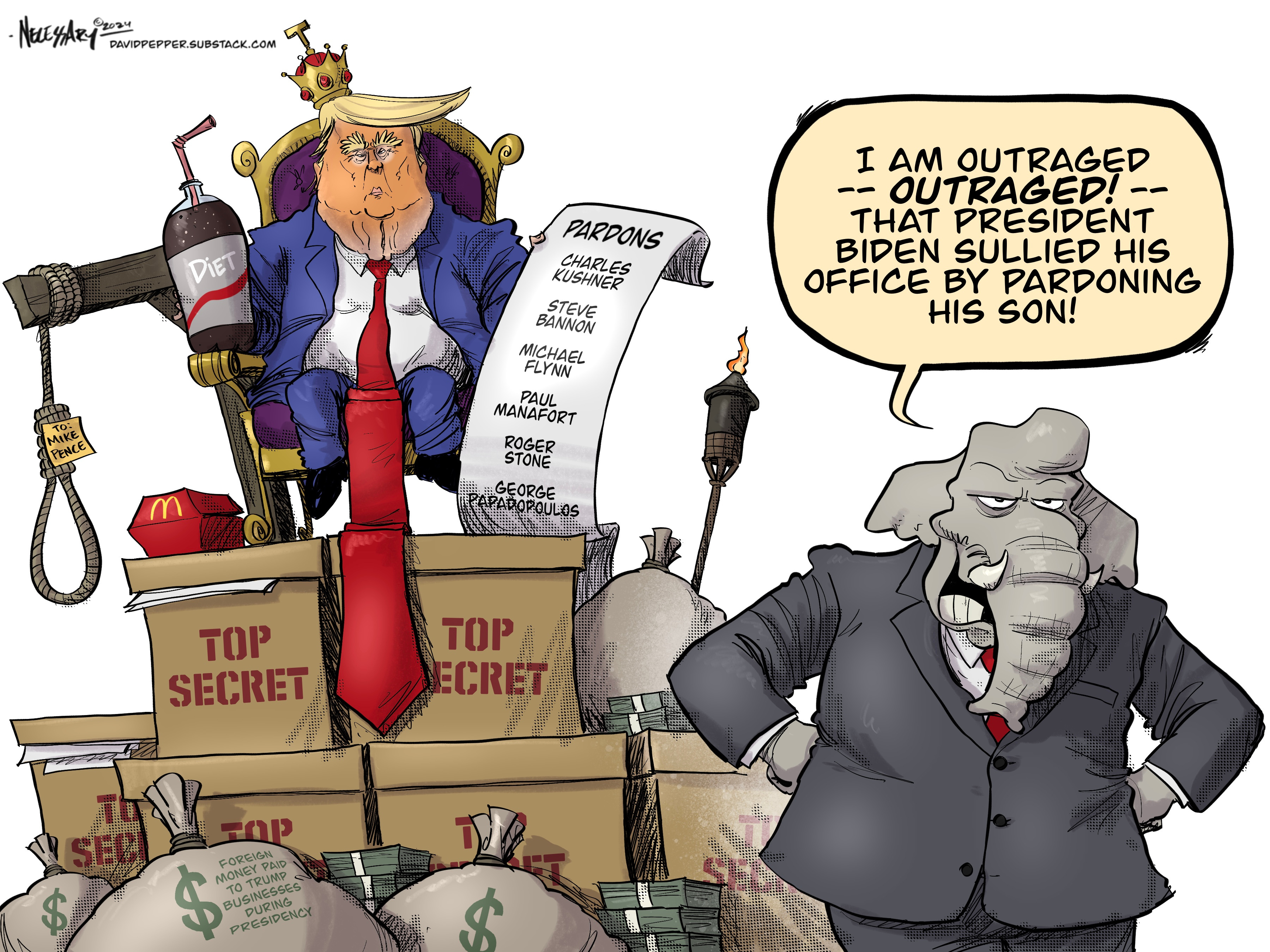 The GOP is up in arms due to President Biden’s pardon of his son, Hunter. The attempt to cast the younger, troubled Biden as some devious villain or as a pawn of his father has continually fallen flat. Millions of taxpayer dollars were wasted by Republicans in Congress on going after Hunter. And now the MAGAts are crowing about President Biden abusing his office by pardoning his son. The Republican hypocrisy is beyond stunning, as they all know their criminal president-elect has and will soon again use the office of the president for his own personal, ill-gotten gain.