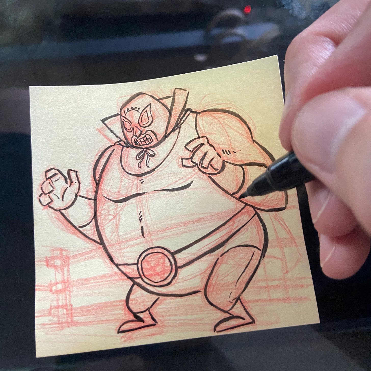 I don’t approach these warmup sketches with any agenda or preconceived notions about what I’m going to draw. The random scribble acts as a primer for my imagination. I often turn the Post-it around for a few minutes, lightly sketching in contour lines, waiting for something to spark my imagination. Once I’ve got a basic idea, it’s go time.