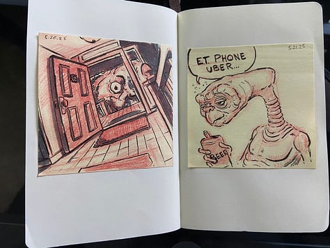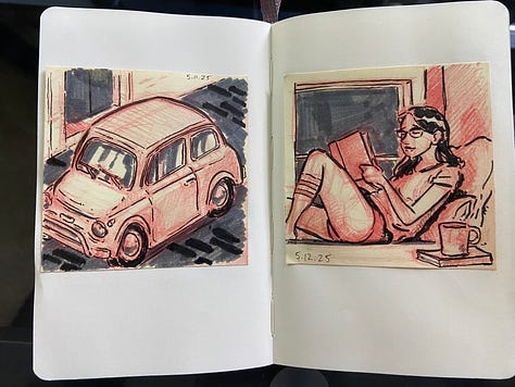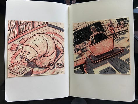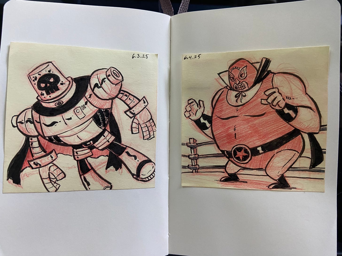 I often surprise myself by what I draw. Some sketches are simple and take only 20 or so minutes. Other days I’m racing against the clock, trying to finish a full scene. Some sketches feel like finished illustrations. Other sketches are sloppy. Many don’t make a lot of sense. But I’ve noticed that they’ve helped spark my imagination as I get into the day’s actual creative work. More importantly, they’re a small island of personal creativity, when so much of my work is public.