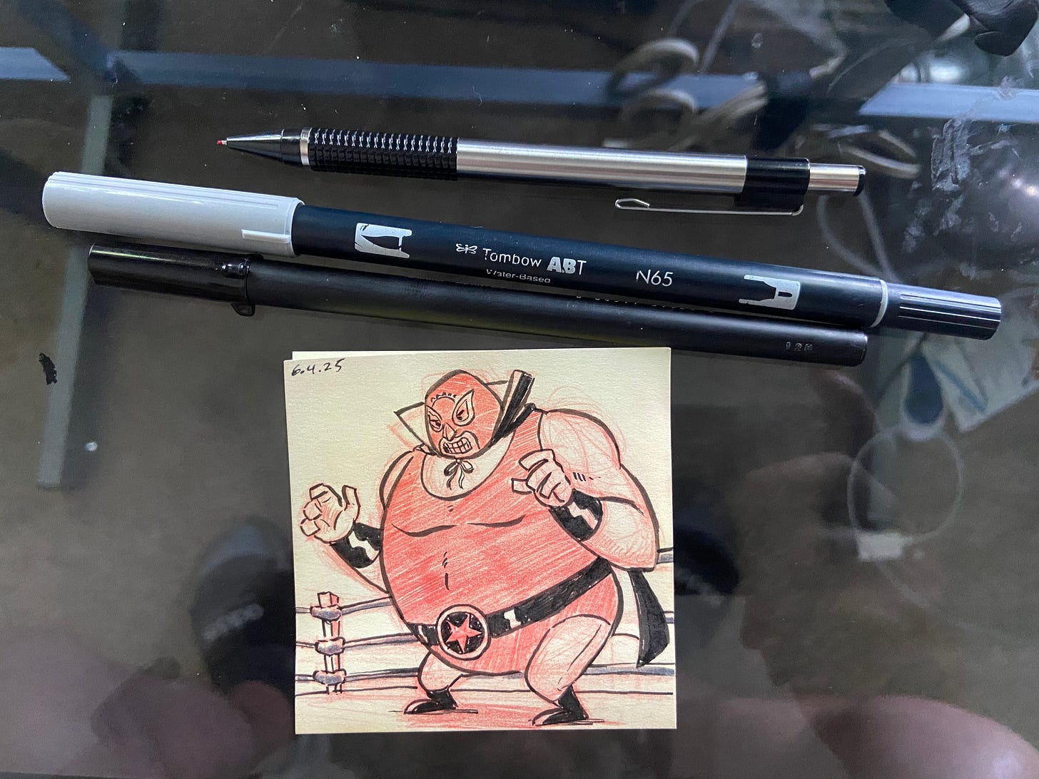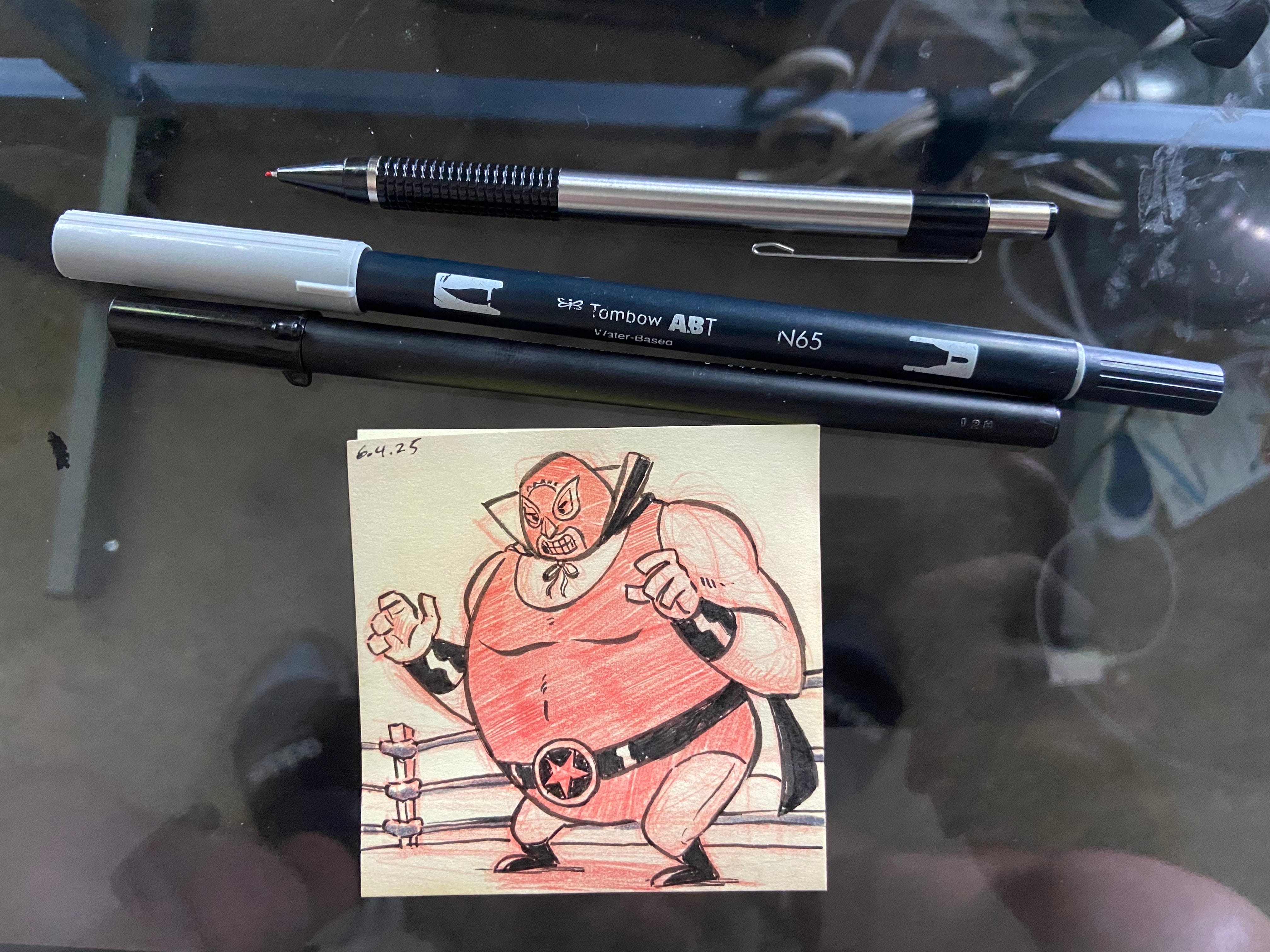 Here’s the setup: I give myself 45 minutes to do a simple sketch on a small Post-it Note using only a mechanical pencil with red lead, a felt-tip art pen, and a gray marker. I keep a cheap kitchen timer on my drawing table. The time constraint gives me a hard deadline, which helps me get out of my head and keeps me on task. And the Post-it and limited drawing supplies helps keep my perfectionism in check. I can’t get lost trying to create a masterpiece when I’ve got 45 minutes, a three-inch canvas and a few drawing implements.